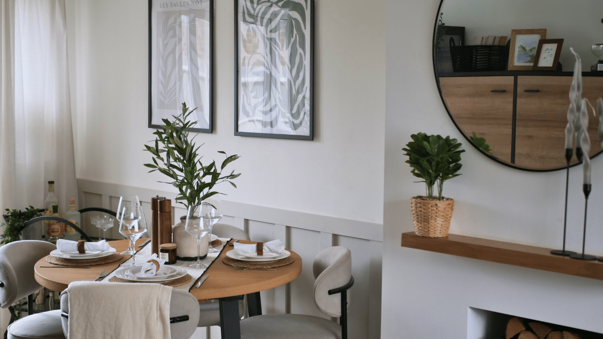 This lovely client wanted a minimal, fresh and open feel for their living and dining space, using cool neutral tones with greenery and wooden accents throughout. The brief included improving storage and reworking the dining layout, as the existing rectangular table was overpowering the room.